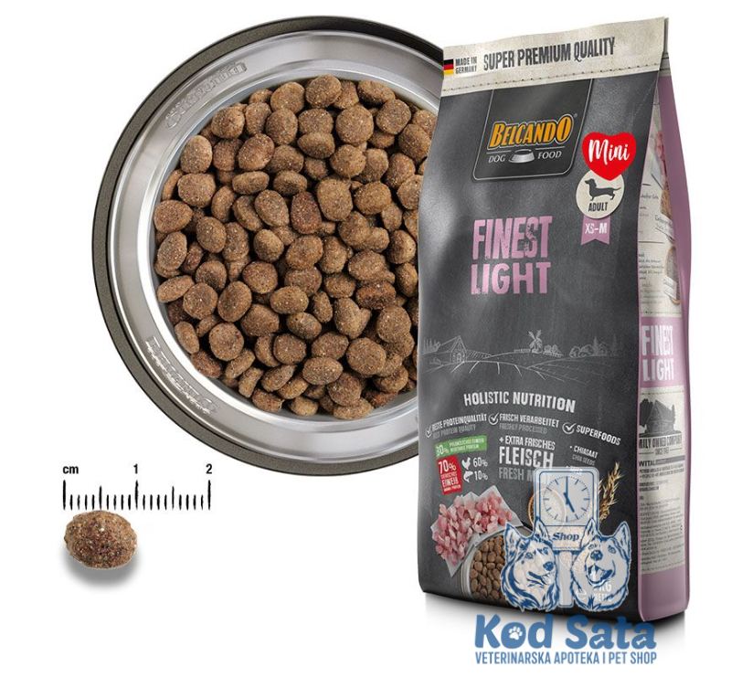 Potpuna hrana za odrasle pse malih i srednjih rasa sa niskim nivoom aktivnosti ili za starije pse. Za pojačavanje ukusa, Belcando Finest Light ima poseban efekat sosa kada se pomeša sa vodom. Pažljivo pomešajte 3 dela Belcando Finest Light granula sa 1 delom tople vode (40–50 °C) kako biste dobili posebno ukusan sos. Ovo je idealna poslastica za probirljive pse. Čak i kada se daje suva, Belcando Finest Light je izuzetno ukusna.