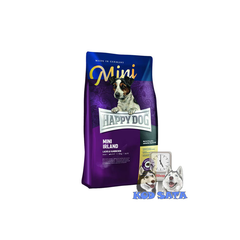 Sir.protein min.21,5%, svarljivi sir.protein 19,5%, sir.masnoća min. 9,5%, sir.vlakna max. 3%, sir.pepeo max. 7%, vlažnost max. 8%, kalcijum 1,4%, fosfor 0,9%, natrijum 0,4%. happy dog mini irelandPitanja i odgovori