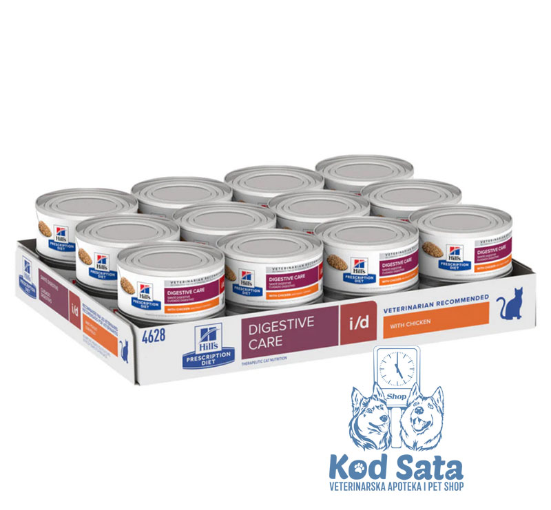 Hill's Prescription Diet i/d sa piletinom je visoko svarljiva kompletna dijetetska vlažna hrana za mačke, namenjena za smanjenje poremećaja apsorpcije u crevima, podršku kod lošeg varenja i kod egzokrine insuficijencije pankreasa.