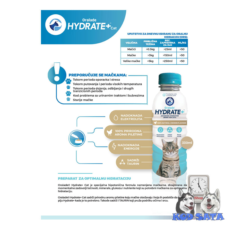 • Oralade® Hydrate+ je posebno razvijeno, hipotonično piće za brzo snabdevanje tečnosti, minerala, glukoze i hranljivih materija koje su mačkama potrebne za optimalan balans tečnosti.